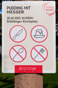 Am Montag, 20.10. rufen wir um 16:30 Uhr dazu auf, am Stühlinger Kirchplatz Pudding mit Messern zu essen. Der Flashmob soll als Protest gegen die im Sommer eigeführte Messerverbotszone gelten aber auch zur Belebung des Parks beitragen. Selbstverständlich sollen nur stumpfe Buttermesser zum Einsatz kommen, eine Nutzung zum Essen fällt